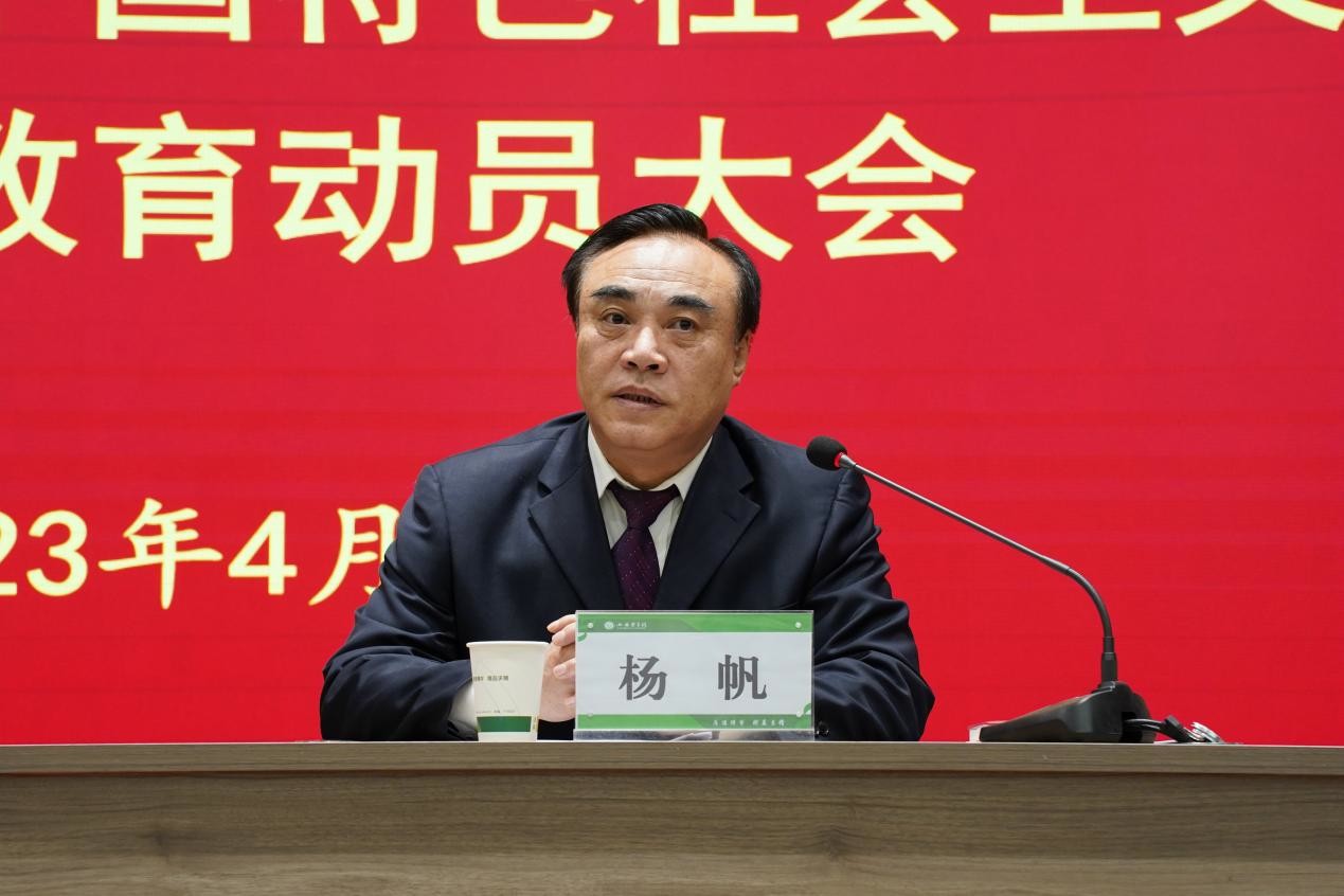 杨帆结合主题教育目标任务,提出了学校开展主题教育的工作安排和具体要求。一要充分认识开展学习贯彻习近平新时代中国特色社会主义思想主题教育的重大意义,切实把思想和行动统一到习近平总书记重要讲话精神和党中央及省委决策部署上来。要坚持思想建党、理论强党,坚持学思用贯通、知信行统一;贯彻新时代党的建设总要求,努力把我们党建设得更加坚强有力;教育引导党员干部把群众观点和群众路线深深植根于思想中、具体落实到行动上;教育引导党员干部发扬革命传统和优良作风,把学校党的建设和高质量发展的各项工作任务落实到位。二要牢牢把握主题教育的总要求、根本任务和具体目标,不折不扣地贯彻落实。要把学习教育贯穿始终,在学思想中铸忠诚;把调查研究贯穿始终,在强党性中真作为;把检视问题贯穿始终,在重实践中补短板;把整改落实贯穿始终,在整改中见成效;把推动高质量发展贯穿始终,在建新功中促发展。三要加强领导、精心筹划,确保学习贯彻习近平新时代中国特色社会主义思想主题教育扎实有效开展。要精心谋划组织,落实领导责任;严格标准质量,务求取得实效;立足改字当头,注重建章立制;坚持两手齐抓,做到统筹兼顾。